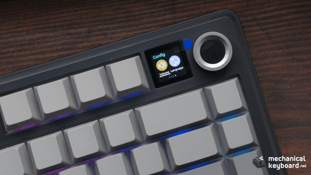 The small TFT screen in the corner shows the essential information such as battery and wireless mode. The knob beside it works well for volume and brightness adjustments. It does not have the premium clicky feel of a high end encoder but it is functional and convenient.
